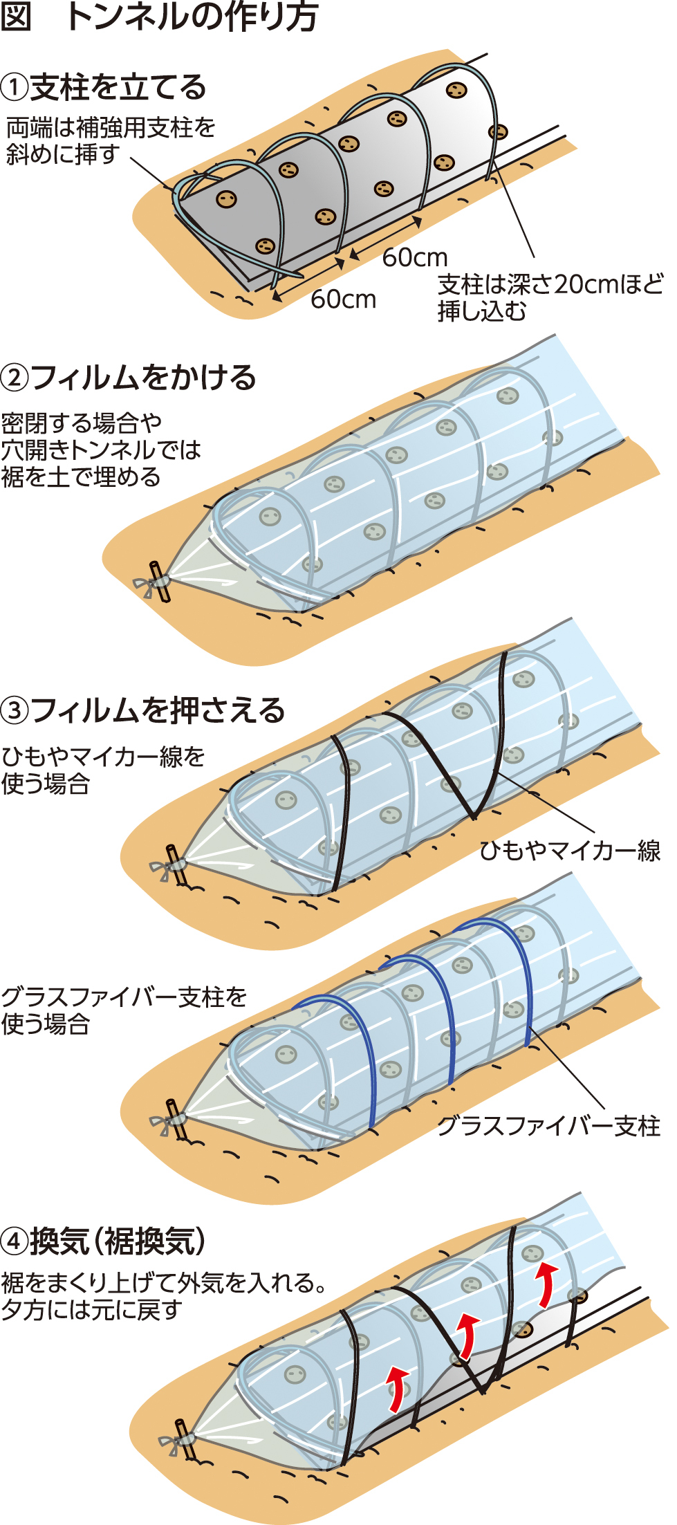 |      トンネル栽培は野菜を寒さから守り、生育を促進させることで露地栽培よりも早い収穫ができます。また、トンネルがけをすれば霜に当たりにくいため、野菜が長持ちし長期間収穫できるメリットもあります。[野菜の種類と品種を選ぶ]寒さに強い根菜類やホウレンソウ、小松菜などの葉菜類は、中間地(温暖地)では本格的に寒くなる11月下旬ごろからトンネルがけをすれば、冬から春の端境期に収穫できます。品種選びでは耐寒性があり、寒さに当たってもとう立ち(つぼみができ、花茎が伸びる)が起こりにくい品種を選ぶと良いでしょう。
