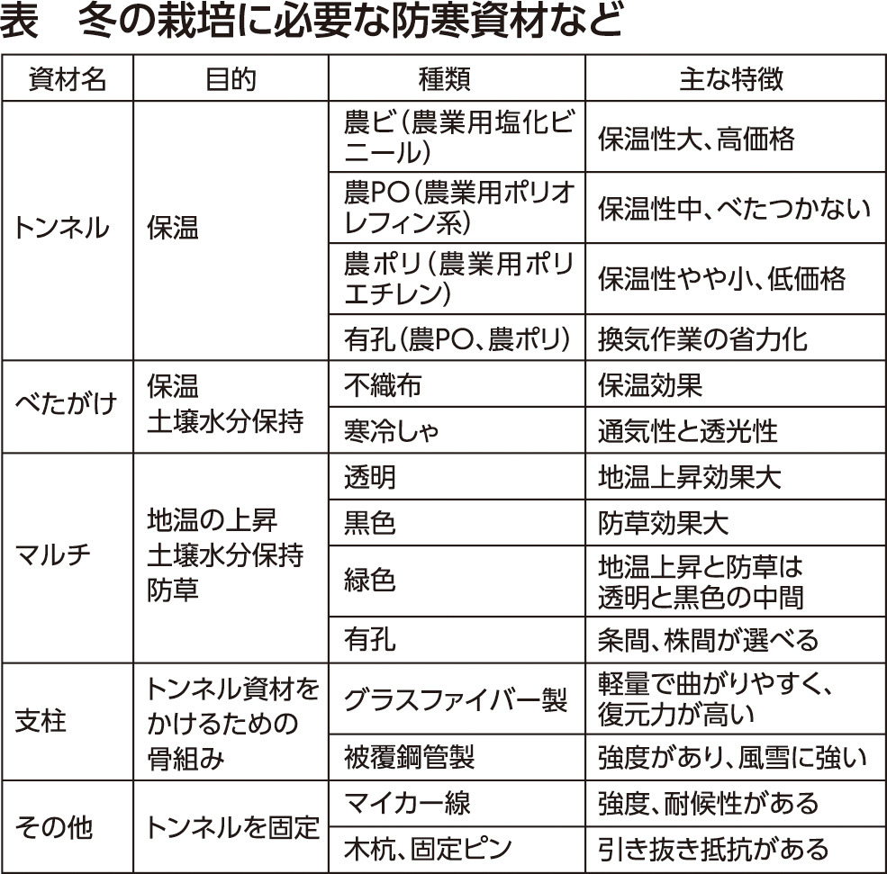 防寒資材の特徴などについてまとめた表を参考にしてください。