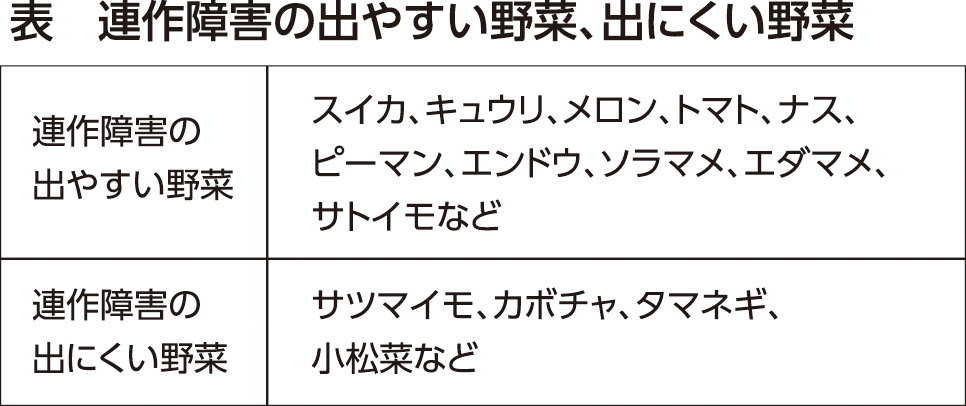 [連作と輪作]同じ畑に同じ野菜を連続して作ることを「連作」といいます。連作すると生長に障害が出る野菜があります。エンドウは一度作ると、4、5年は作れません。ナス、トマト、ソラマメ、サトイモなどは3、4年、レタス、ハクサイ、イチゴなどは2年、ホウレンソウ、コカブ、インゲンなどは1年です。サツマイモ、カボチャ、タマネギのように連作しても生長に障害が見られない野菜もあります(表)。