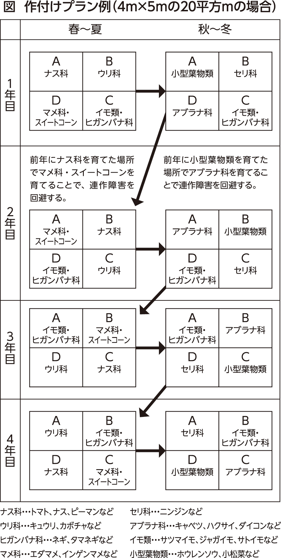 このような連作障害を防ぎ、地力が衰えないようにするためには性質の異なる野菜を計画的に順次、作付けする「輪作」をします。