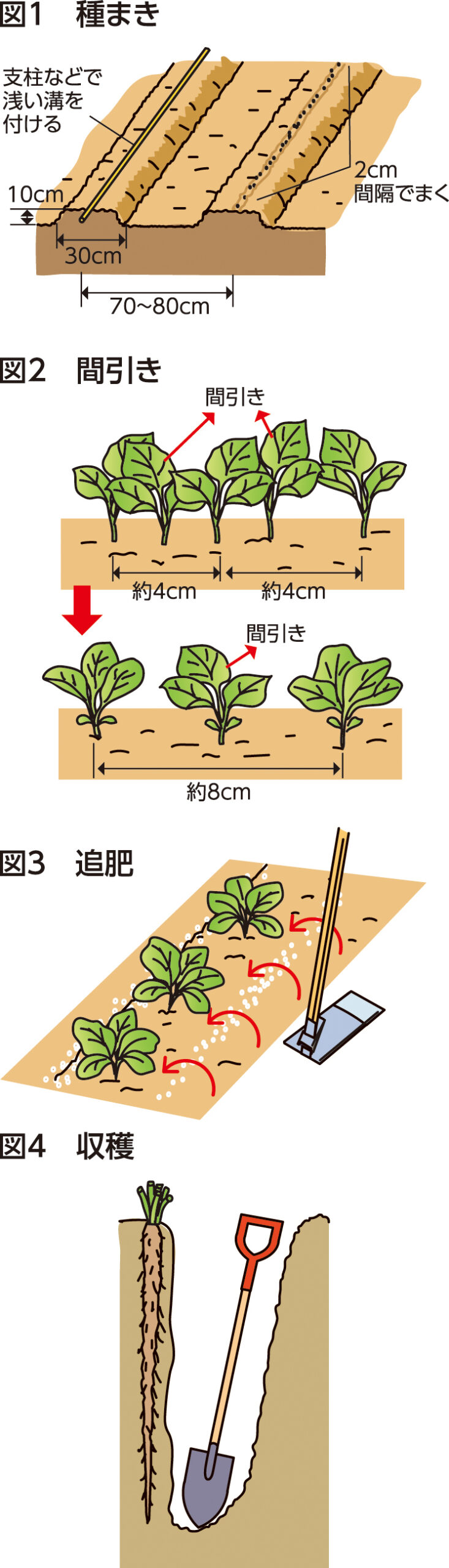 [間引き] 本葉1枚で株間が約4cm間隔になるように間引き、2回目は本葉3、4枚で株間が約8cm間隔になるように間引きます(図2)。