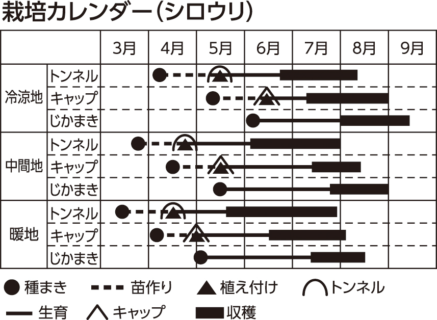 [品種] 地方品種として各地で固有の品種があります。いずれの品種も200~300gほどで若取りすれば浅漬け用、1kg程度に大きくすればかす漬け用になります。家庭菜園では比較的入手しやすい「沼目白瓜」(タキイ種苗など)、「白はぐらうり」(サカタのタネなど)、「青はぐら」(トキタ種苗など)などがお薦めです。その他、東京の「東京早生白瓜」、京都の「桂白瓜」、香川の「讃岐白瓜」などが伝統野菜として受け継がれています。