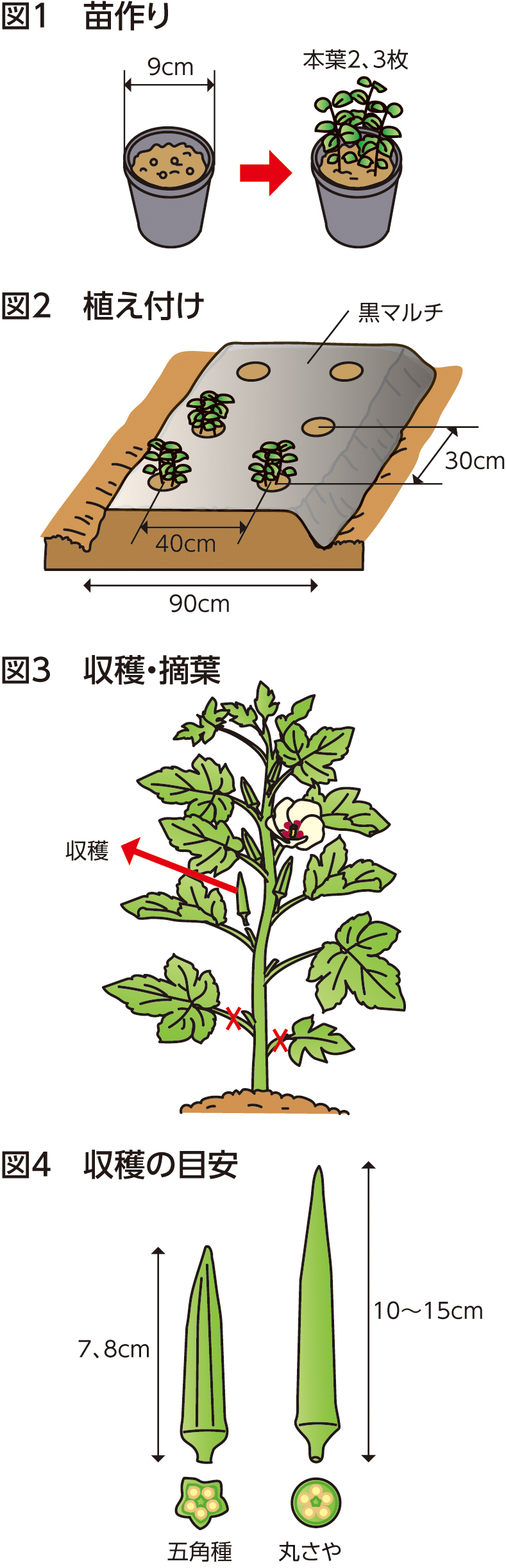 [収穫] 開花後7~10日の若いさやを、五角種は長さ7、8cm、丸さや種は長さ10~15cmで収穫します(図4)。日照不足や低温が原因で、実に米粒大の突起物ができる「いぼ果」となる場合がありますが、食べても差し支えありません。